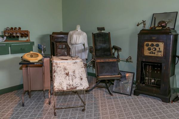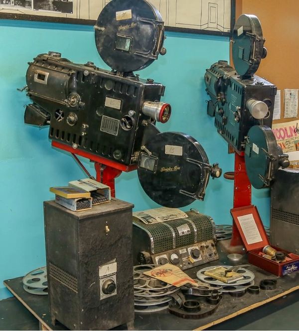 Film projectors and reels used at the Pastime Theatre, Pine Bluffs, Wyoming.