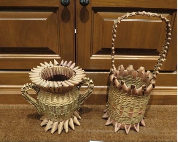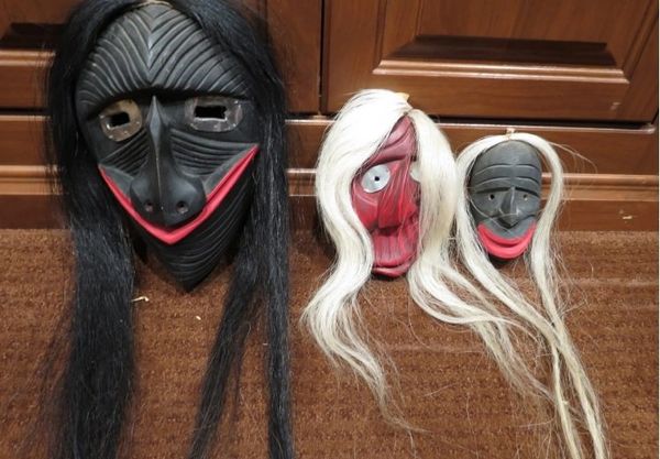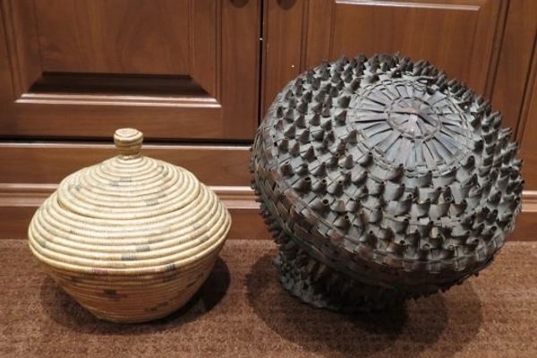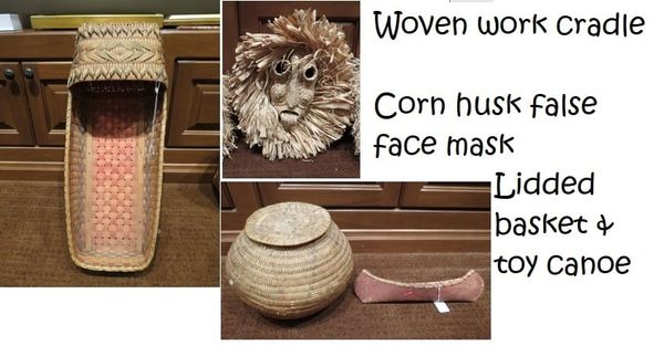 Woven work cradle, corn husk false face mask, lidded basket & toy canoe.
