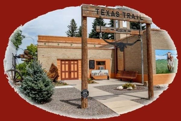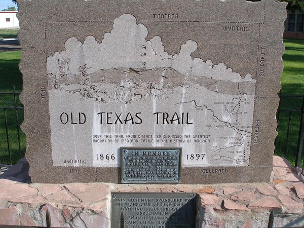 Old Texas Trail stone monument located in the park next to the Texas Trail Museum in Pine Bluffs, Wyoming.
