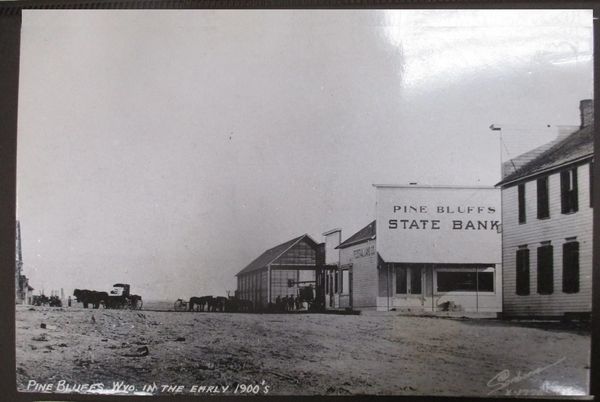 Horses and carriages, and Pine Bluffs State Bank early 1900's. Pine Bluffs, Wyoming.