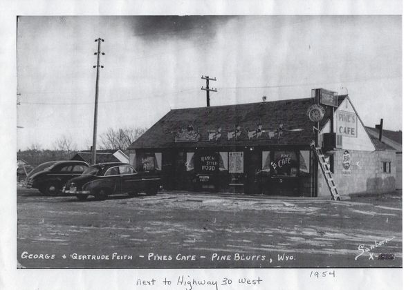 1954. Pine's Cafe owned and operated by George and Gertrude Feith. Located along Highway 30, Pine Bluffs, Wyoming.